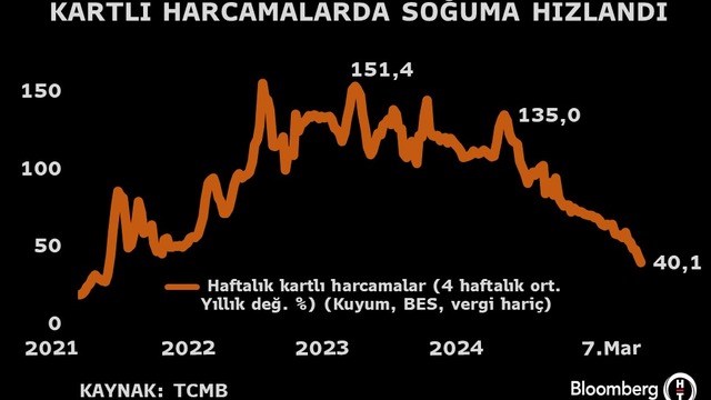 Kartlı harcamalardaki değişim yıllık ortalaması önceki hafta yüzde 38,7 seviyesinde 7 Mart haftasında 32,7 seviyesinde kaydedilirken kuyum, BES ve vergi hariç dört haftalık ortalamalardaki yıllık değişim yüzde 40'ı aştı.