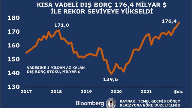 Kısa vadeli dış borç stoku, Şubat sonu itibarıyla, 2021 yıl sonuna göre yüzde 8,5 oranında artışla 130,5 milyar dolar oldu.