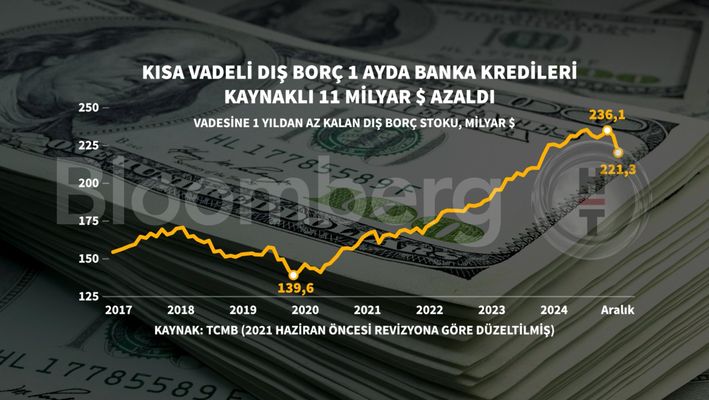 Türkiye Cumhuriyet Merkez Bankası (TCMB) verilerine göre vadesine 1 yıldan az kalmış kısa vadeli dış borç stoku Aralık itibariyle 11,4 milyar dolar düşüşle 221,3 milyar dolara geriledi. Bu düşüş 2021 Haziran ayından bu yana en hızlı düşüş olarak kaydedildi.