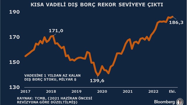Türkiye Cumhuriyet Merkez Bankası verilerine göre Ekim sonu itibarıyla, orijinal vadesine bakılmaksızın vadesine 1 yıl veya daha az kalmış dış borç verisi kullanılarak hesaplanan kalan vadeye göre kısa vadeli dış borç stoku, 186,3 milyar dolara yükseldi. Önceki ay bu veri 185,9 milyar dolar olmuştu.