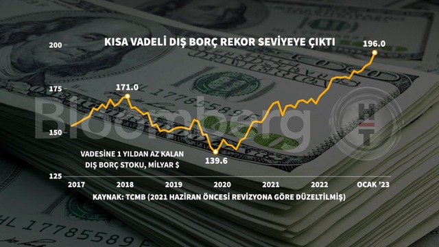 TCMB verilerine göre, 2023 Ocak sonu itibarıyla 1 yıl veya daha az vadesi kalmış dış borç, 196 milyar dolara yükselerek rekor serisini dördüncü aya taşıdı.