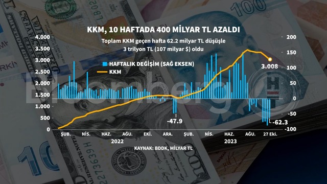 Bankacılık Düzenleme ve Denetleme Kurumu (BDDK) verilerine göre kur korumalı mevduatlar 27 Ekim haftasında 62,3 milyar TL düşüş kaydetti. Bu dönemde kur korumalı mevduatlarda toplam büyüklük 3 trilyona geriledi. Dolar cinsinden bakıldığında ise KKM'de toplam tutar 107 milyar dolar oldu.