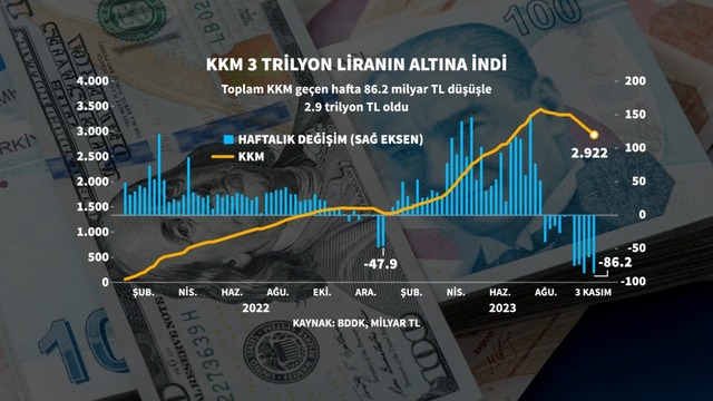 3 Kasım haftasında KKM'de düşüş 86,2 milyar TL'ye ulaştı. Son 10 haftada KKM'lerde 447 milyar TL gerileme kaydedildi.