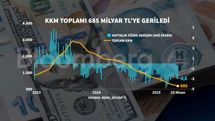 Bankacılık Düzenleme ve Denetleme Kurumu (BDDK) verilerine göre kur korumalı mevduatlar 25 Nisan haftasında 21,4 milyar TL gerileyen KKM hesapları 685,2 milyar TL'ye geriledi.