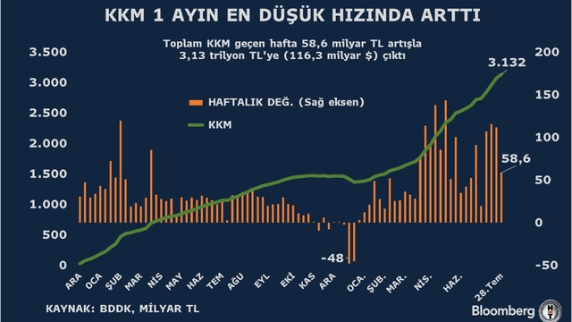Bankacılık Düzenleme ve Denetleme Kurumu (BDDK) verilerine göre, kur korumalı mevduatların toplamı 28 Temmuz haftasında 58,6 milyar dolar artış kaydetti. Toplam büyüklük 3,13 trilyon liraya, dolar cinsinden hesaplandığında da 116,3 milyar dolara yükseldi.