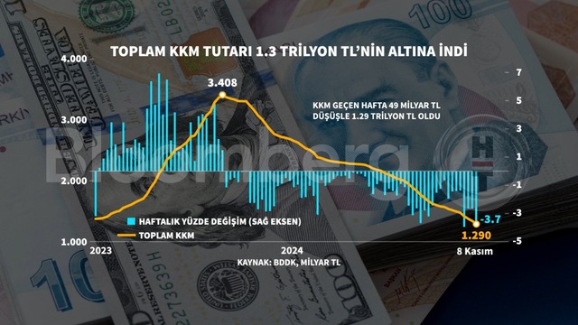 Verilere göre kur korumalı mevduatların toplam büyüklüğü de 8 Kasım haftası itibariyle 1,29 trilyon TL olarak kaydedildi.