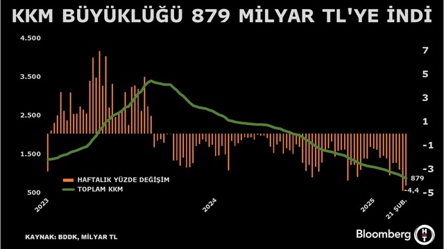Bankacılık Düzenleme ve Denetleme Kurumunun (BDDK) yayımladığı haftalık bültenine göre, KKM 919,6 milyar TL'den, 879,3 milyar TL'ye geriledi.