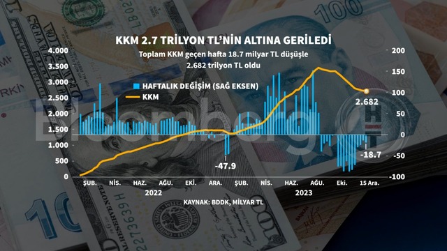 Bankacılık Düzenleme ve Denetleme Kurumu verilerine göre kur korumalı mevduatlar 15 Aralık haftasında 18,7 milyar TL'lik düşüş gösterdi. Böylelikle toplam kur korumalı mevduat büyüklüğü 2,68 trilyon TL olarak kaydedildi.