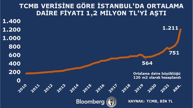 Türkiye Cumhuriyet Merkez Bankası konut fiyat endeksine göre Aralık'ta konut fiyatları bir önceki yılın aynı dönemine göre yüzde 59,59 arttı. Böylelikle endeks tarihinin en sert artışı kaydedildi.