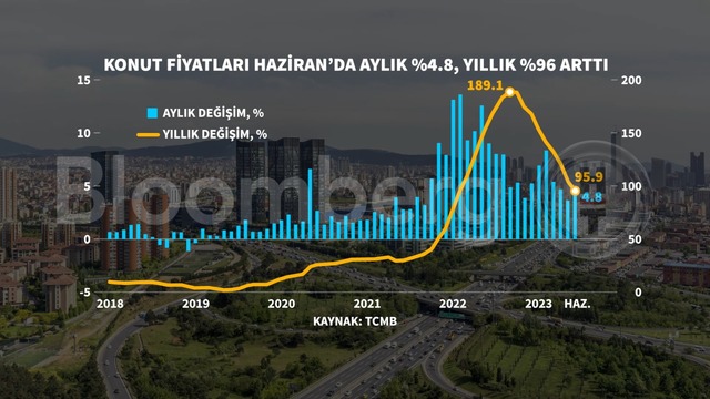 Konut fiyatları Haziran'da bir önceki yılın aynı dönemine göre yüzde 96 arttı. Böylelikle konut fiyatları Şubat 2022'den bu yana ilk kez çift haneli artış görüldü.
