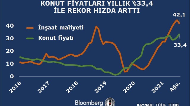 TCMB'nin konut fiyat endeksi Ağustos'ta yıllık yüzde 33,4 artışla endeks tarihinin en hızlı artışını kaydetti. Yeni konutlarda yıllık fiyat artışı yüzde 40 olarak kaydedildi.