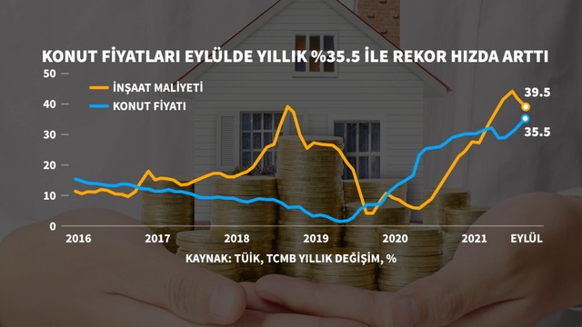 Türkiye Cumhuriyet Merkez Bankası'nın (TCMB) yayımladığı konut fiyat endeksine göre fiyatlar Eylül'de geçen yılın aynı dönemine göre yüzde 35,51 arttı. Aylık bazda artış ise yüzde 3,17 oldu.