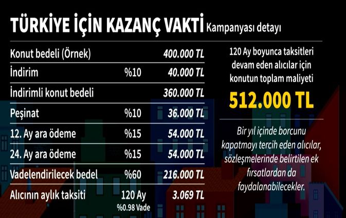 Dün başlayıp 31 Ekim'e kadar sürecek konut kampanyasında banka ve kefalet olmayacak. 12. ve 24. aylarda yüzde 15'lik ara ödeme olacak. 120 ayda yüzde 0.98 vade farkı uygulanacak.