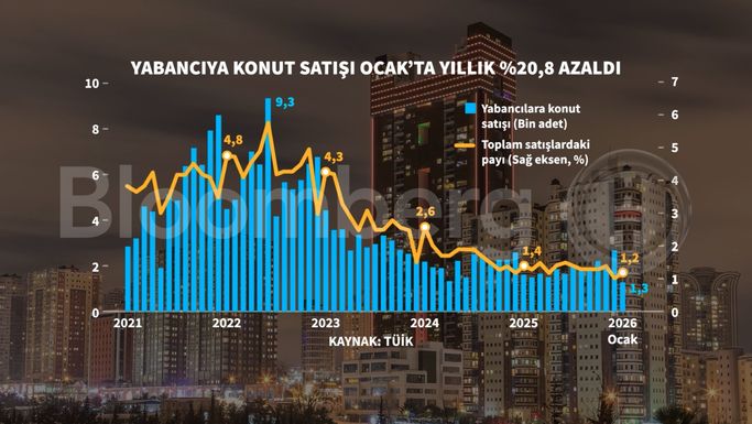 Yabancılara konut satışları ise Ocak ayında sert bir şekilde gerileyerek bin 306 konut satışı gerçekleşti. Gerileme bir önceki yılın aynı göre, yüzde 20,8 olarak kaydedildi.