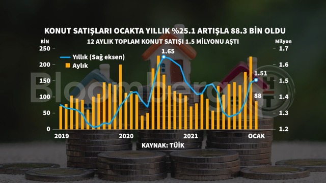 Aralıkta 226 bin olan konut satışları, ocakta yüzde 61'lik düşüşle 88 bine geriledi. Ocakta satışlar, geçen yılın aynı ayına göre ise yüzde 25 arttı. Konut satışları 2021 yıl Haziran ayından sonra ilk kez 100 binin altına geriledi.