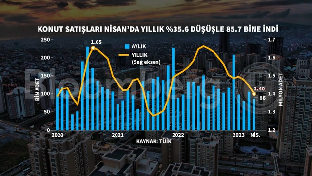 TÜİK verilerine göre, Türkiye genelinde konut satışları Nisan ayında bir önceki yılın aynı ayına göre yüzde 35,6 azalarak 85 bin 652 oldu. İpotekli konut satışları da Nisan ayında bir önceki yılın aynı ayına göre yüzde 32 azalış göstererek 21 bin 769 oldu. İkinci el konut satışları Nisan ayında bir önceki yılın aynı ayına göre yüzde 39,3 düştü.