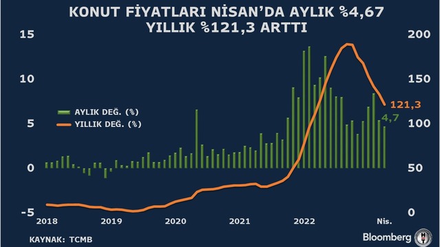 TCMB konut fiyatları endeksi Nisan'da bir önceki yılın aynı dönemine göre yüzde 121,25 artış kaydetti. Böylelikle konut fiyatlarında Mart 2022'den bu yana konut fiyatlarında en düşük yıllık artış görüldü.