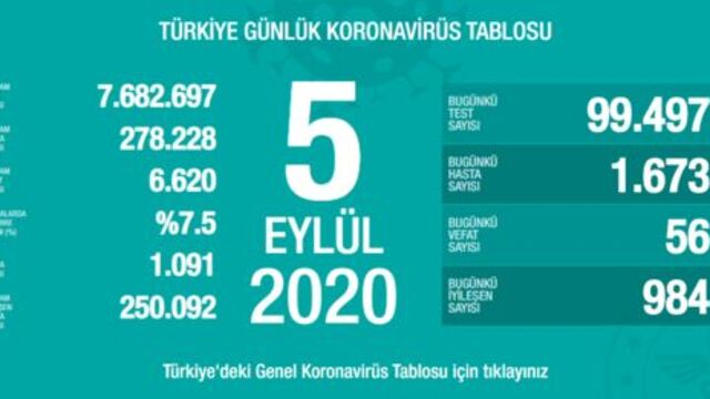 Sağlık Bakanlığı, son 24 saatte 1673 yeni koronavirüs vakası tespit edildiğini, 56 hastanın vefat ettiğini duyurdu