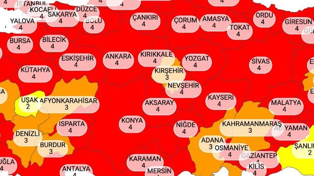 Sağlık Bakanlığının açıkladığı Kovid-19 verileriyle hazırlanan yeni risk haritasına göre, çok yüksek riskli grubunu gösteren kırmızı kategorideki illerin sayısı, nüfusun yüzde 80'ini oluşturan 58 şehre ulaştı.