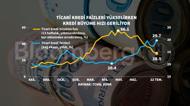 Bankacılık Düzenleme ve Denetleme Kurumu'nun verilerinden yapılan hesaplamaya göre, ticari kredilerde 13 haftalık, yıllıklandırılmış ve kur etkisinden arındırılmış büyüme 22 Temmuz haftası itibariyle yüzde 28,5 seviyesine geldi. Böylelikle kredi büyümesinde 4 ayın en yavaş performansı gerçekleşti.