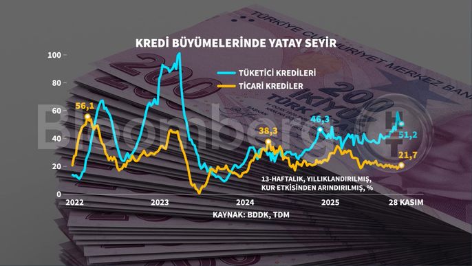 13 haftalık yıllıklandırılmış ve kur etkisinden arındırılmış büyüme ticari kredilerde 28 Kasım haftasında yüzde 51,2 ve tüketici kredi büyümesi de yüzde 21,7 ile yatay bir görünüm arzetti.