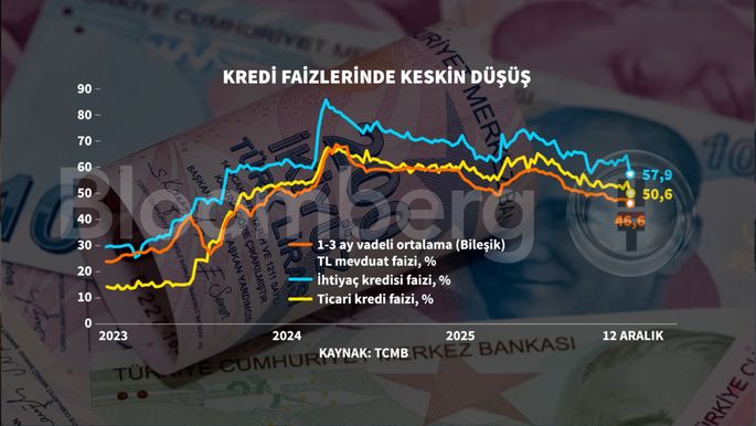 Aynı hafta 1-3 ay vadeli ortalama bileşik TL mevduat faizi de 47,7 seviyesinden yüzde 46,6 seviyesine indi.