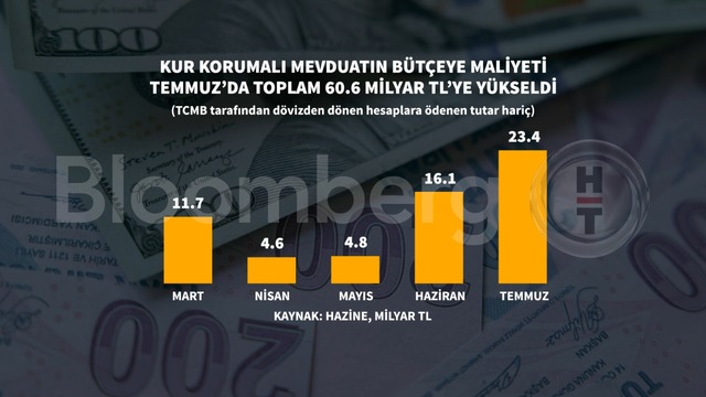 Merkezi yönetim bütçe istatistikleri kur korumalı mevduatın bütçeye maliyetinin Temmuz ayında da arttığına işaret etti. Türkiye Cumhuriyet Merkez Bankası (TCMB) tarafından dövizden dönen hesaplara ödenen tutar hariç kur korumalı mevduatta 5 aylık maliyet 60 milyar TL'yi aştı.