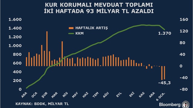 Bankacılık Düzenleme ve Denetleme Kurumu (BDDK) verilerine göre, kur korumalı mevduatların büyüklüğü 6 Ocak haftasında 45,3 milyar TL düşüşle 1,37 trilyon TL'ye indi. Böylelikle son iki haftada kur korumalı mevduatlardan 93 milyar TL'lik çıkış kaydedildi.