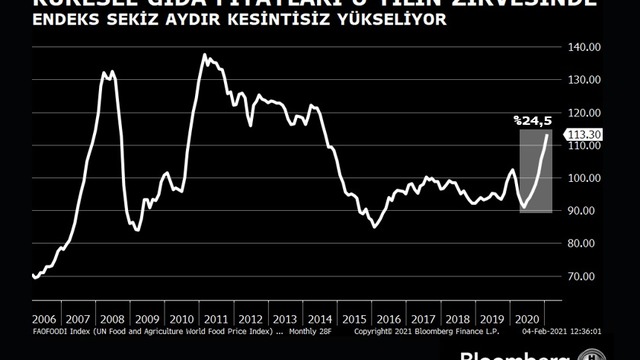Aralık ayında 107,5 seviyesinde açıklanan Endeks 108,6'ya revize edilirken, Ocak ayında yüzde 4,33 artarak 113,3 seviyesine yükseldi. Böylece küresel gıda fiyatları Temmuz 2014'ten bu yana en yüsek seviyeyi gördü.