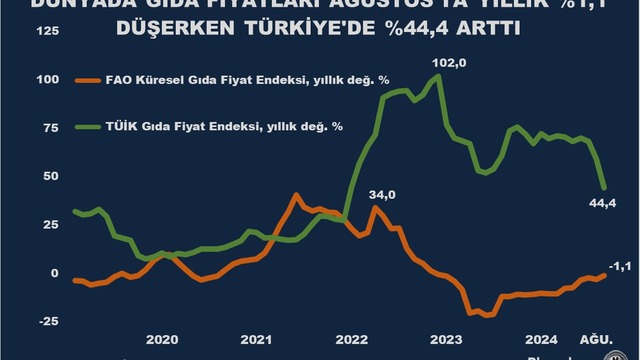 Küresel gıda fiyatların Ağustos ayında yıllık yüzde 1,1 düşüş kaydederken Türkiye'de gıda enflasyonu yıllık yüzde 44,4 artış gösterdi.