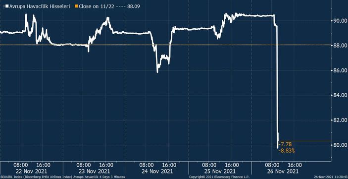 Avrupa Havacılık Endeksi yeni varyant haberleri sonrasında keskin bir düşüş kaydederken Euro Stoxx 600 endeksi güne yüzde 2,5'tan fazla düşüşle başladı. FTSE 100 endeksi de yüzde 3'e yakın düşüş kaydederken DAX'ta düşüşler yüzde 3'ü geçti.