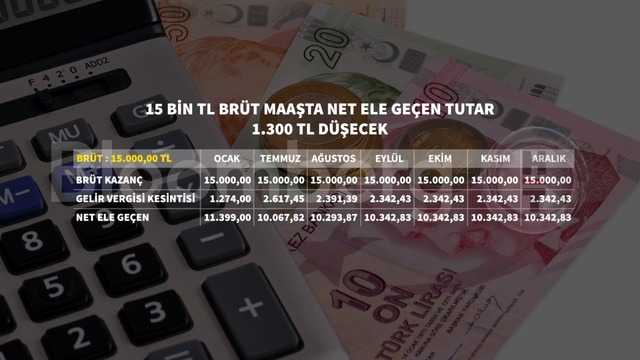 • Temmuz'daki maaş artışları sonrası vergi dilimi ve basamakları aynı kalınca brüt maaşla anlaşanların net gelir kaybı arttı. Yıl sonunda brüt 12 bin TL alanların net ele geçen tutarı 6 bin lira, 15 bin lira alanların ise yaklaşık 9 bin lira düşmüş olacak.