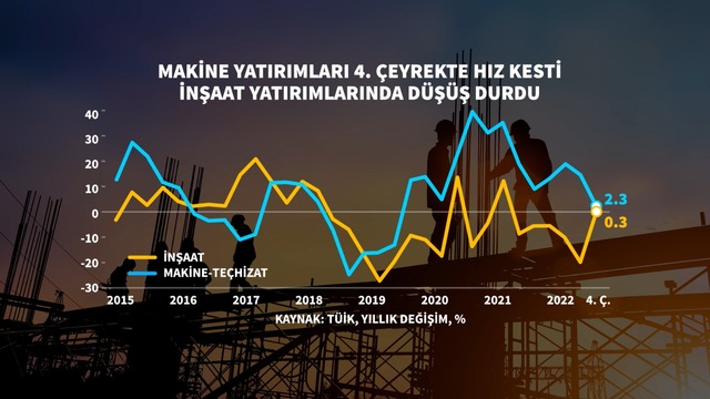 İnşaat yatırımları 2022 son çeyreğine gelene kadar beş çeyrekte yıllık olarak daralma kaydetmişti. 2022 son çeyreğinde inşaat yatırımları yüzde 0,3 de olsa büyüme gösterdi.
