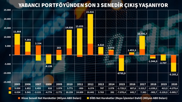 Yabancılar Türk varlıklarını son 3 yıldır portföylerinden çıkarmaya devam ederken 2020 yılında ise Türkiye’den tüm zamanların en büyük yabancı yatırımcı çıkışı yaşandı. Yabancı salgın yılında 5 milyar dolarlık tahvil ve 4,2 milyar dolarlık hisse satarak toplamda 9,2 milyarlık türk varlığı satışı gerçekleştirmiş oldu.