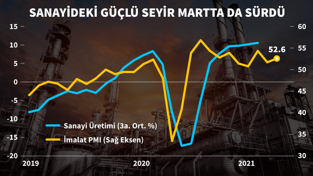 İstanbul Sanayi Odası Türkiye Sektörel PMI mart verilerine göre sektörlerin çoğunluğunda üretim artışı kaydedilmekle birlikte yeni sipariş hacimleri genel olarak durağan seyretti ve firmalar malzeme temininde zorluklarla karşılaşmaya devam etti. Bu arada, enflasyonun yeniden hız kazandığına yönelik sinyaller gözlendi.