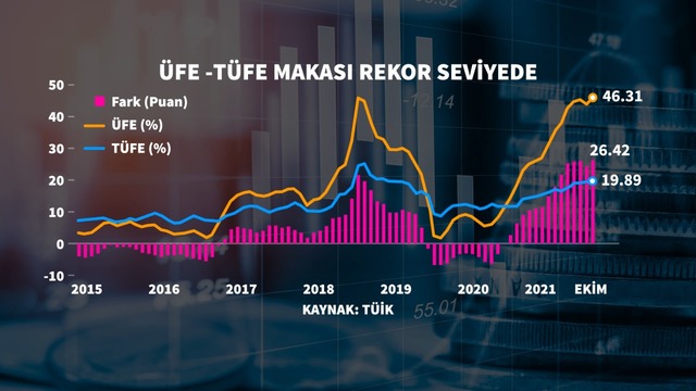 Türkiye İstatistik Kurumu (TÜİK) Ekim ayına ilişkin verilerine göre tüketici fiyat endeksi önceki yılın aynı dönemine göre yüzde 19,89 arttı. Aylık bazda artış yüzde 2,39 olarak kaydedildi. Ekim'de üretici enflasyonu ise yıllık yüzde 46,31 oldu. Böylelikle yıllık üretici enflasyonunda Haziran 2002'den bu yana en yüksek seviye izlendi. Rakamlar tüketici ve üretici enflasyonu arasındaki makasın da rekor seviyeye yükseldiğini gösterdi.