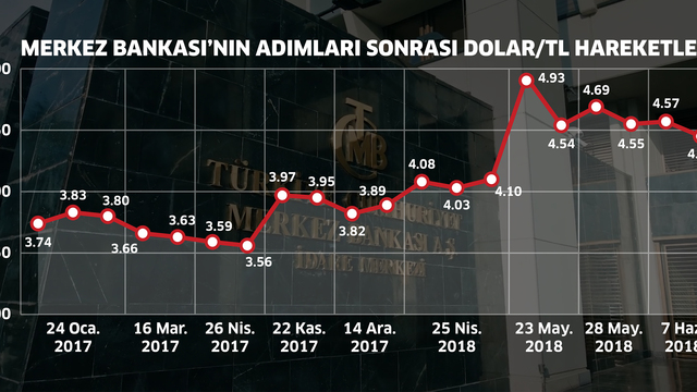 7 HAZİRAN 2018: MB'nin kararı öncesinde 4.58'de olan kur, 125 baz puan faiz artış kararıyla yüzde 1'den fazla düşürek 4.55 seviyesine çekildi.
