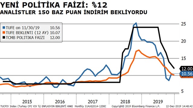 Türkiye Cumhuriyet Merkez Bankası yılın son toplantısında politika faizini 200 baz puan düşürerek % 14'ten % 12'ye indirdi.
