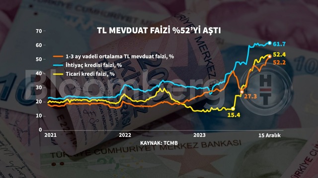 Faizlerdeki artışa parelel olarak mevduat faizleri de yüzde 52'yi aştı. Mevduat faizleri yüzde 52,2 seviyesine çıkarken, ticari kredi faizleri yüzde 52,4 seviyesini gördü.
