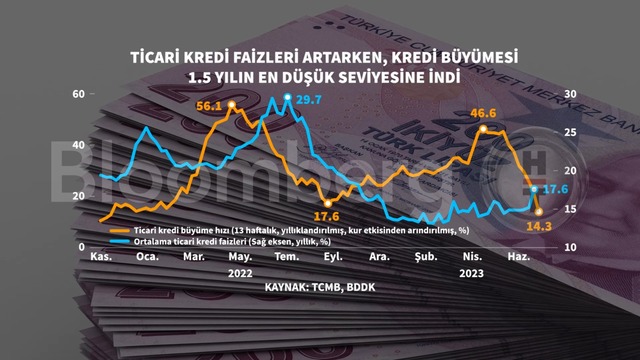 Kredi hacminde büyüme tüm kredi türlerinde hız keserken ticari kredi büyümesi de Mayıs başındaki yüzde 46,6’lık son dönem zirvesinden Haziran sonu itibarıyla yüzde 14,3’e kadar geriledi.