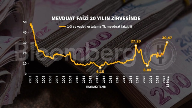 Türkiye Cumhuriyet Merkez Bankası'nın (TCMB) verilerine göre mevduatta ağırlıklı bölümü oluşturan 1-3 ay arası mevduatlarda faiz 12 Mayıs haftası itibariyle yüzde 30'un üzerine çıktı. Böylelikle Ekim 2003'ten bu yana 1-3 ay vadeli mevduatlarda ilk kez yüzde 30 seviyesinin üzeri görüldü.