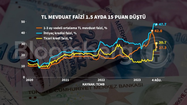 Türkiye Cumhuriyet Merkez Bankası (TCMB) verilerine göre mevduatların ağırlıklı olduğu 1-3 ay arası vadeli mevduatlarda ortalama faiz 4 Ağustos haftası itibariyle yüzde 28'in altına indi. Böylelikle mevduat faizlerinde 1,5 ayda 15 puana varan düşüş kaydedildi.