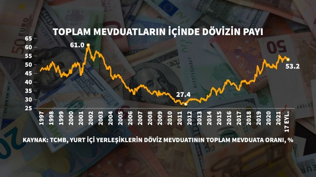 Türkiye'de toplam mevduatlar içinde dövizin payı yüzde 53 seviyesi etrafındaki seyrini koruyor.