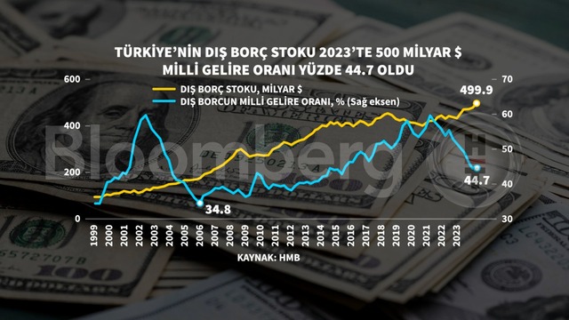 • Hazine ve Maliye Bakanlığı, Türkiye'nin brüt dış borç stokunun 31 Aralık 2023 itibarıyla 499,9 milyar dolar, net dış borç stokunun ise 261,4 milyar dolar olduğunu bildirdi.