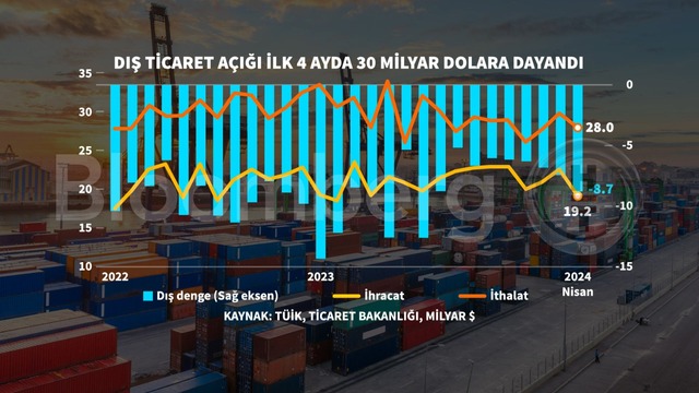 2023 yılı Ocak-Nisan döneminde dış ticaret açığı 43,5 milyar dolar iken, 2024 yılı Ocak-Nisan döneminde yüzde 30,5 azalarak 30,2 milyar dolara geriledi.