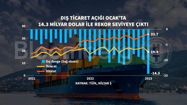 Ticaret Bakanlığı'nın açıkladığı geçici verilere göre Ocak ayında dış ticaret açığı 14,4 milyar dolarla rekor seviyeye yükseldi.