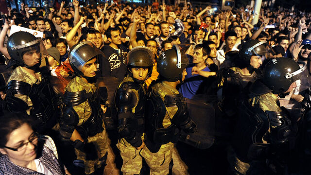 "Asker uyusun polis beklesin", "En büyük asker bizim asker" sloganları atan gruptan bazı kişilerin, polise bira şişesi ve plastik su şişesi atması, yine göstericiler tarafından protesto edildi.