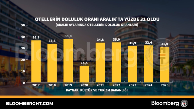 Bloomberg HT Grafik Otellerin doluluk oranı Aralık'ta yüzde 31 oldu Otellerin doluluk oranı Aralık'ta yüzde 31 oldu 06 Şubat 2026, 18:26 Güncelleme : 06 Şubat 2026, 18:26