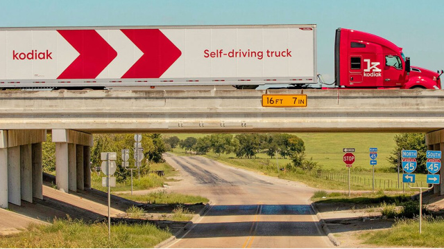 Karayolu, endüstriyel ve savunma amaçlı otonom sürüş kamyonları geliştiren Kodiak, frenleme, direksiyon, sensörler ve bilgisayarlar için yedek sistemlere sahip bir otonom sürüş sistemi geliştirmiş ve tasarlamıştı. Ocak 2025'te Kodiak'ın otonom sürüş kamyonları, Batı Teksas ve Doğu Yeni Meksika'nın petrol zengini Permian Havzası'nda Atlas Energy Solutions için sürücüsüz teslimatlar yapmaya başladı. Kodiak, o zamandan beri iki şirket arasındaki anlaşma kapsamında ilk 100 kamyonluk siparişin bir parçası olarak Atlas Energy'ye en az sekiz otonom sürüş kamyonu teslim etti. Kodiak, Atlas'a teslim ettiği sürücüsüz kamyonların donanımını üstlenen Roush Industries ile birlikte çalışıyor. Eylül 2025'te özel amaçlı satın alma şirketi Ares Acquisition Corporation II ile birleşme yoluyla halka açılan Kodiak, şimdi teknolojisini kamyon kitleleri için ölçeklendirmek istiyor.