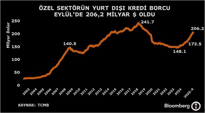 Eylül ayı itibarıyla özel sektörün yurt dışından sağladığı toplam kredi borcu, 206,2 milyar dolara ulaştı.